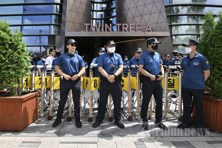 Petugas polisi berjaga di depan gedung kedutaan Jepang di Seoul pada 24 Agustus 2023, saat pengunjuk rasa Korea Selatan berkumpul untuk berdemonstrasi menentang pembuangan air limbah olahan Jepang dari pembangkit listrik tenaga nuklir Fukushima yang lumpuh. (Photo by Jung Yeon-je / AFP)