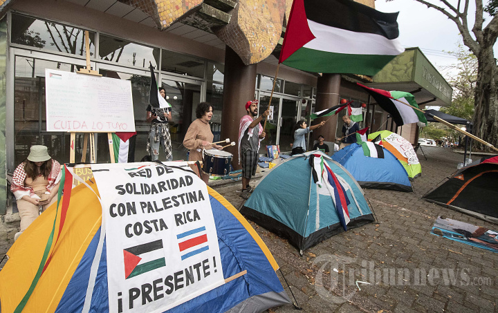 Sekelompok mahasiswa berdemonstrasi dengan bendera Palestina di perkemahan pro-Palestina di Universitas Kosta Rika (UCR) di San Jose pada 2 Mei 2024. (Photo by Ezequiel BECERRA / AFP)