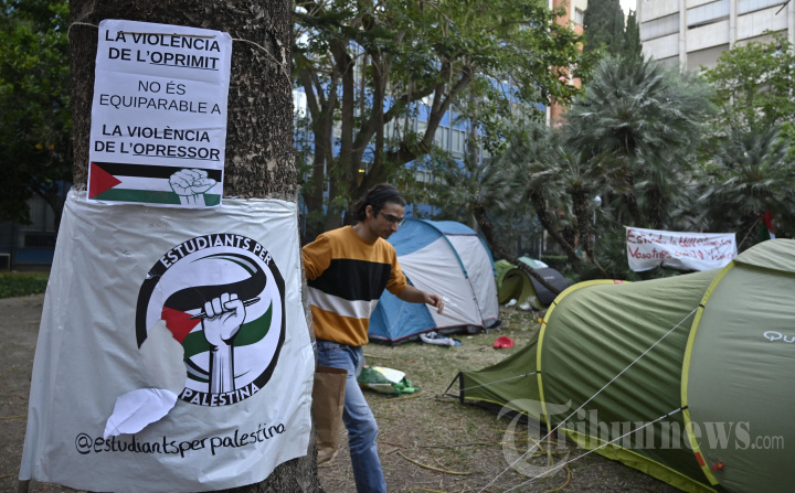 Seorang pria berjalan melewati spanduk bertuliskan "Mahasiswa untuk Palestina" di sebuah perkemahan di kampus Universitas Valencia sebagai bagian dari protes terhadap perang di wilayah Palestina di Gaza, pada 3 Mei 2024, di Valencia. - Puluhan universitas di Amerika Serikat, dan di negara-negara lain, juga menyaksikan demonstrasi pro-Palestina dalam beberapa minggu terakhir, yang berujung pada bentrokan dengan polisi dan protes balasan. (Photo by JOSE JORDAN / AFP)