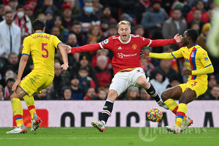 Gelandang Manchester United Belanda Donny van de Beek (tengah) bereaksi selama pertandingan sepak bola Liga Premier Inggris antara Manchester United dan Crystal Palace di Old Trafford di Manchester, barat laut Inggris, pada 5 Desember 2021. (Photo by Paul ELLIS / AFP) / RESTRICTED TO EDITORIAL USE.