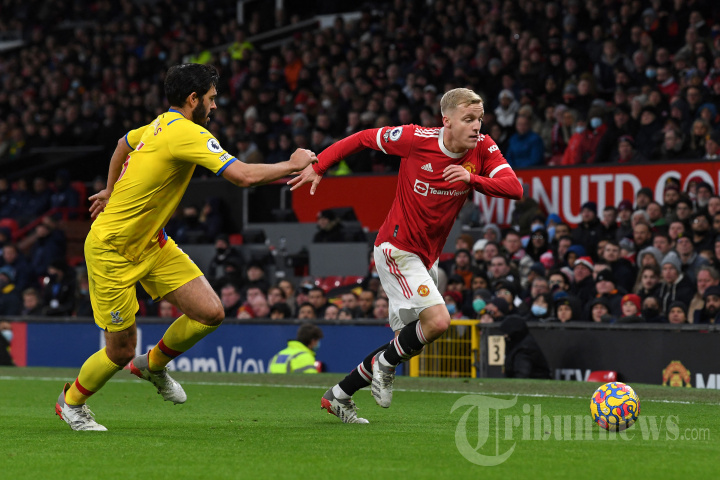 Bek Crystal Palace Inggris James Tomkins (kiri) bersaing dengan gelandang Manchester United Belanda Donny van de Beek (kanan) selama pertandingan sepak bola Liga Premier Inggris antara Manchester United dan Crystal Palace di Old Trafford di Manchester, barat laut Inggris, pada 5 Desember 2021. (Photo by Paul ELLIS / AFP) / RESTRICTED TO EDITORIAL USE.