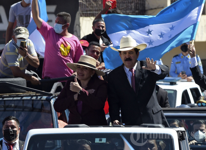 Presiden terpilih Honduras Xiomara Castro (CL) mengacungkan jempol saat suaminya mantan Presiden Honduras (2006-2009) Manuel Zelaya melambai saat mereka berkendara di sepanjang Suyapa Boulevard menuju Stadion Nasional, di mana upacara pelantikannya akan berlangsung, di Tegucigalpa , pada 27 Januari 2022. - Presiden terpilih Honduras Xiomara Castro akan dilantik sebagai presiden wanita pertama negara itu pada Kamis, saat kebingungan menguasai siapa yang akan menjadi ketua kongres selama masa jabatan empat tahunnya. (Photo by Orlando SIERRA / AFP)