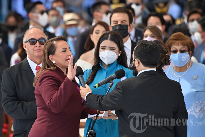 Presiden terpilih Honduras Xiomara Castro (kiri) bersumpah di samping cucunya Irene Melara (tengah) selama upacara pelantikannya, di Tegucigalpa, pada 27 Januari 2022. - Presiden terpilih Honduras Xiomara Castro dilantik sebagai presiden wanita pertama negara itu pada Kamis, saat kebingungan menguasai siapa yang akan menjadi ketua kongres selama masa jabatan empat tahunnya. (Photo by Luis Acosta / AFP)