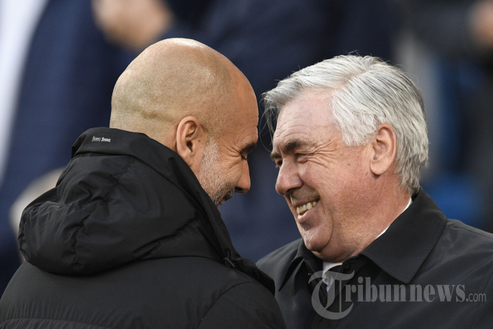 Manajer Manchester City Spanyol Pep Guardiola (kiri) berbicara dengan pelatih Real Madrid Italia Carlo Ancelotti sebelum dimulainya pertandingan sepak bola leg pertama semifinal Liga Champions UEFA antara Manchester City dan Real Madrid, di Stadion Etihad, di Manchester, pada April 26, 2022. (Photo by Oli SCARFF / AFP)