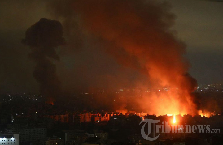 "Pesawat tempur musuh melancarkan dua serangan di pinggiran selatan, yang pertama menargetkan wilayah Saint Therese, dan yang kedua menargetkan wilayah Burj al-Barajneh," kata Kantor Berita Nasional Lebanon. (Photo by STRINGER / AFP)