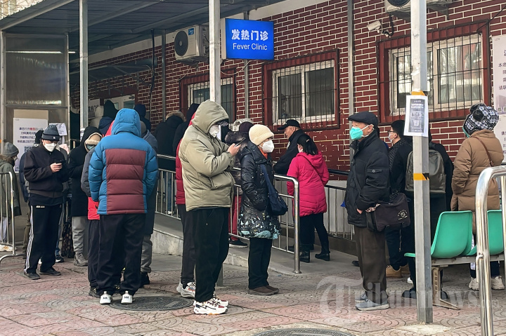 Orang-orang mengantre di luar klinik demam di tengah pandemi Covid-19 di Beijing pada 14 Desember 2022.