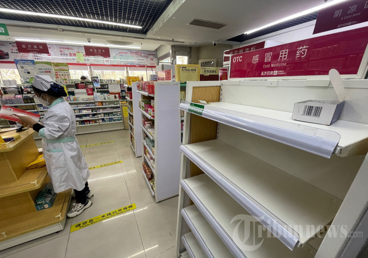 Foto ini memperlihatkan rak obat flu yang kosong di apotek di tengah pandemi Covid-19 di Beijing pada 15 Desember 2022. (Photo by Yuxuan ZHANG / AFP)