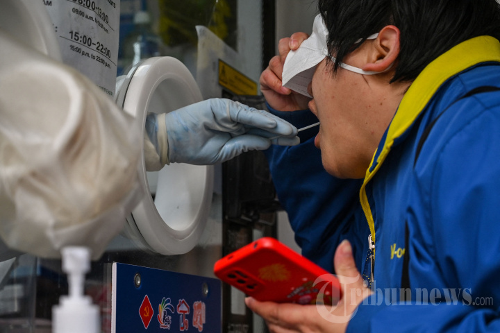 Seorang petugas kesehatan mengambil sampel swab dari seorang wanita untuk menguji virus corona Covid-19 di Shanghai pada 18 Desember 2022. (Photo by HECTOR RETAMAL / AFP)