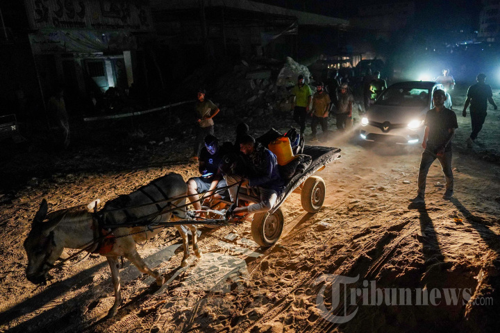 Warga Palestina yang mengungsi meninggalkan daerah di timur Khan Yunis menuju barat, setelah tentara Israel mengeluarkan perintah evakuasi baru untuk beberapa bagian kota, di Jalur Gaza selatan pada 22 Juli 2024, di tengah konflik yang sedang berlangsung antara Israel dan kelompok militan Hamas Palestina. (Photo by Bashar TALEB / AFP)