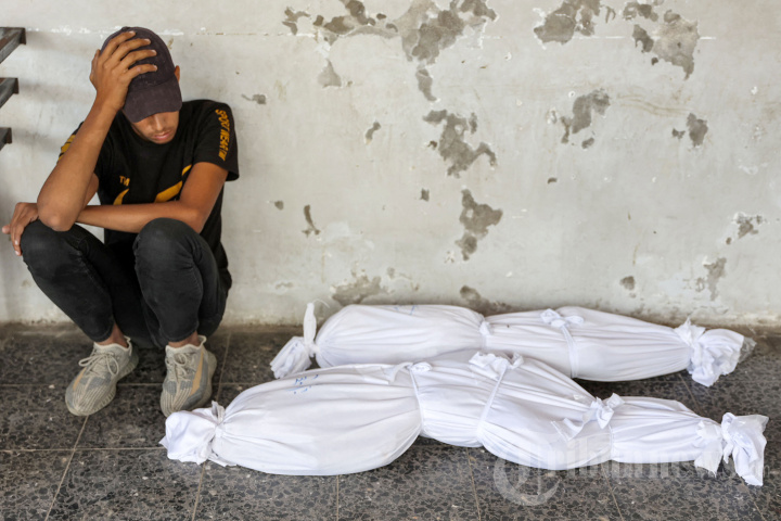 Seorang anak laki-laki bereaksi saat ia duduk di dekat jenazah anak-anak yang terbunuh dalam pemboman Israel semalam, di rumah sakit Ahli Arab di Kota Gaza pada tanggal 2 Oktober 2024 di tengah perang yang sedang berlangsung di wilayah Palestina antara Israel dan Hamas. (Photo by Omar AL-QATTAA / AFP)