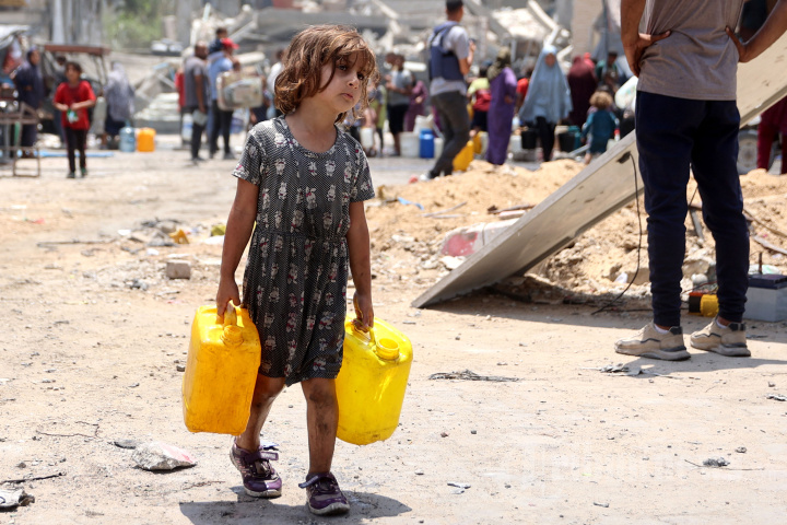 Seorang gadis Palestina membawa wadah berisi air di kamp pengungsi Jabalia di Jalur Gaza utara pada 3 Juni 2024, di tengah konflik yang sedang berlangsung antara Israel dan kelompok militan Hamas Palestina. (Photo by Omar Al Qatta / AFP)