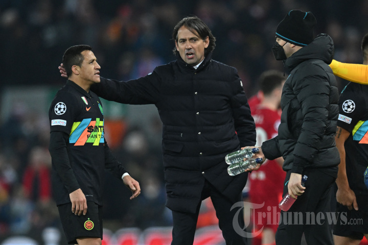 Pelatih Inter Milan asal Italia, Simone Inzaghi (tengah) berbicara dengan striker Inter Milan asal Chili, Alexis Sanchez (kiri) dalam laga leg kedua babak 16 besar Liga Champions antara Liverpool melawan Inter Milan di Stadion Anfield, Liverpool, Inggris barat laut, Rabu (9/3/2022) dini hari WIB. Pertandingan tersebut berakhir dengan skor 0-1 (0-0) untuk Inter, namun Liverpool tetap lolos ke babak perempat final karena unggul agregat 2-1. AFP/PAUL ELLIS