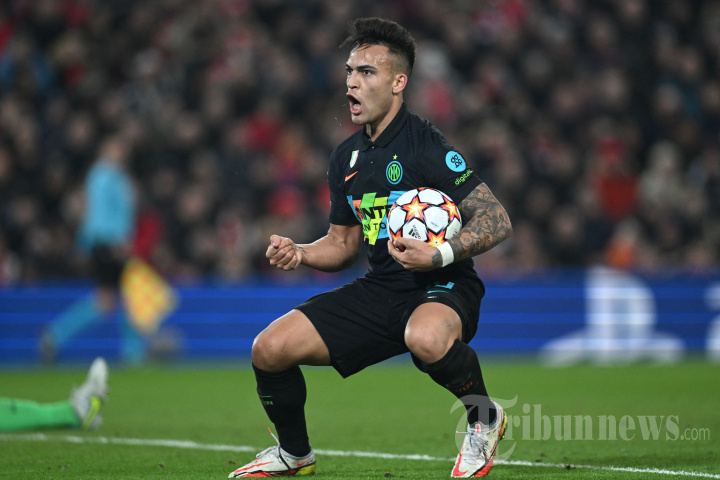 Striker Inter Milan asal Argentina, Lautaro Martinez melakukan selebrasi usai mencetak gol dalam laga leg kedua babak 16 besar Liga Champions antara Liverpool melawan Inter Milan di Stadion Anfield, Liverpool, Inggris barat laut, Rabu (9/3/2022) dini hari WIB. Pertandingan tersebut berakhir dengan skor 0-1 (0-0) untuk Inter, namun Liverpool tetap lolos ke babak perempat final karena unggul agregat 2-1. AFP/PAUL ELLIS