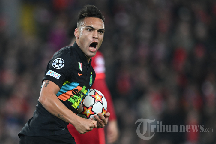 Striker Inter Milan asal Argentina, Lautaro Martinez melakukan selebrasi usai mencetak gol dalam laga leg kedua babak 16 besar Liga Champions antara Liverpool melawan Inter Milan di Stadion Anfield, Liverpool, Inggris barat laut, Rabu (9/3/2022) dini hari WIB. Pertandingan tersebut berakhir dengan skor 0-1 (0-0) untuk Inter, namun Liverpool tetap lolos ke babak perempat final karena unggul agregat 2-1. AFP/PAUL ELLIS