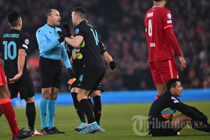 Gelandang Inter Milan asal Kroasia, Ivan Perisic (tengah) mempertanyakan keputusan wasit asal Spanyol, Mateu Lahoz (kedua dari kiri) yang memberi kartu kuning kedua kepada striker Inter Milan asal Chili, Alexis Sanchez (kanan bawah) dalam laga leg kedua babak 16 besar Liga Champions antara Liverpool melawan Inter Milan di Stadion Anfield, Liverpool, Inggris barat laut, Rabu (9/3/2022) dini hari WIB. Pertandingan tersebut berakhir dengan skor 0-1 (0-0) untuk Inter, namun Liverpool tetap lolos ke babak perempat final karena unggul agregat 2-1. AFP/PAUL ELLIS