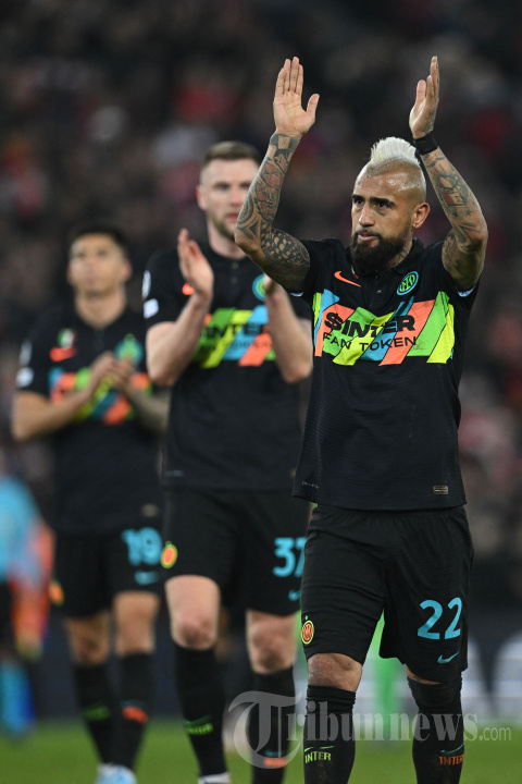 Gelandang Inter Milan asal Chili, Arturo Vidal (kanan) bertepuk tangan untuk para suporter seusai laga leg kedua babak 16 besar Liga Champions antara Liverpool melawan Inter Milan di Stadion Anfield, Liverpool, Inggris barat laut, Rabu (9/3/2022) dini hari WIB. Pertandingan tersebut berakhir dengan skor 0-1 (0-0) untuk Inter, namun Liverpool tetap lolos ke babak perempat final karena unggul agregat 2-1. AFP/PAUL ELLIS
