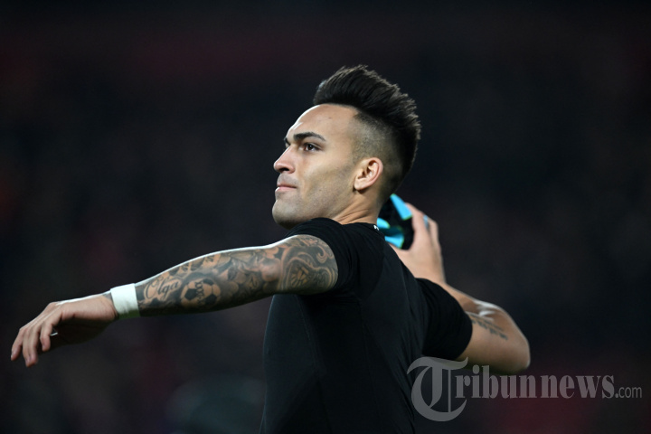 Striker Inter Milan asal Argentina, Lautaro Martinez hendak melemparkan kausnya ke arah suporter seusai laga leg kedua babak 16 besar Liga Champions antara Liverpool melawan Inter Milan di Stadion Anfield, Liverpool, Inggris barat laut, Rabu (9/3/2022) dini hari WIB. Pertandingan tersebut berakhir dengan skor 0-1 (0-0) untuk Inter, namun Liverpool tetap lolos ke babak perempat final karena unggul agregat 2-1. AFP/PAUL ELLIS