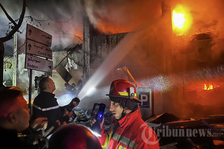 Petugas pemadam kebakaran Lebanon memadamkan api di lokasi serangan Israel yang menargetkan sebuah gedung di jalan Mar Elias, Beirut pada 17 November 2024. (Photo by Ibrahim AMRO / AFP)