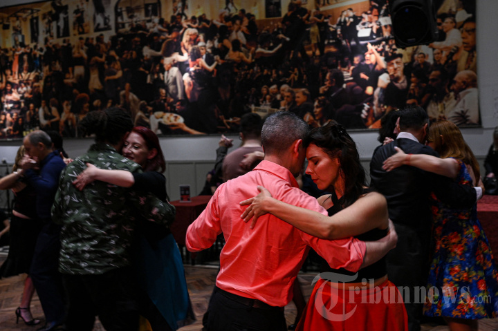 Pasangan menari tango selama Festival Tango dan Kejuaraan Tango Dunia, di milonga Salon Canning di Buenos Aires pada 7 September 2022. - Seperti setiap tahun, Buenos Aires sekali lagi menjadi kiblat bagi para penari internasional yang berpartisipasi hingga 18 September di Tango Piala Dunia. Bagi banyak pengunjung, mencari sepatu yang ideal akan menjadi hal yang harus dilakukan di antara kompetisi. (Photo by Luis ROBAYO / AFP)