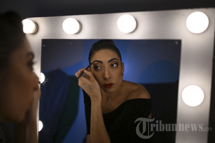 Seorang penari di belakang panggung merias wajah sebelum tampil di Kejuaraan Tango Dunia di Buenos Aires, pada 9 September 2022. - Seperti setiap tahun, Buenos Aires sekali lagi menjadi kiblat para penari internasional yang berpartisipasi hingga 18 September di Piala Dunia Tango. Bagi banyak pengunjung, mencari sepatu yang ideal akan menjadi hal yang harus dilakukan di antara kompetisi.