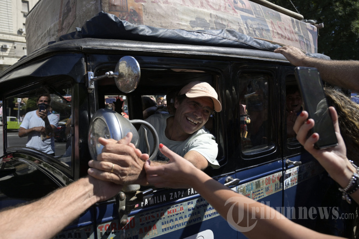 Herman Zapp dari Argentina dan keluarganya mengendarai mobil mereka, Graham-Paige 1928, di jalan 9 de Julio di Buenos Aires, pada 13 Maret 2022 untuk menyelesaikan perjalanan 22 tahun keliling dunia yang dimulai pada 23 Januari 2000. (Photo by JUAN MABROMATA / AFP)