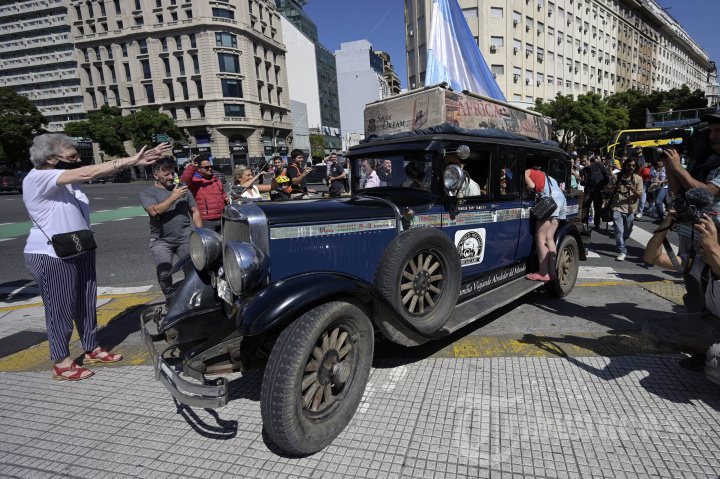 Keluarga Zapp Argentina mengendarai mobilnya, Graham-Paige 1928, di jalan 9 de Julio di Buenos Aires, pada 13 Maret 2022 untuk menyelesaikan perjalanan 22 tahun keliling dunia yang dimulai pada 23 Januari 2000.