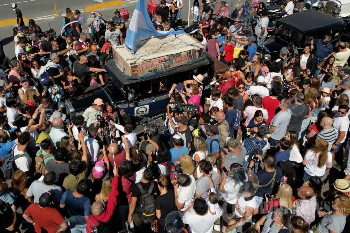 Keluarga Zapp Argentina dan mobil mereka, Graham-Paige 1928, dikelilingi oleh jurnalis dan warga di Republica square di Buenos Aires, pada 13 Maret 2022 setelah menyelesaikan perjalanan 22 tahun keliling dunia yang dimulai pada 23 Januari 2000. (Photo by JUAN MABROMATA / AFP)