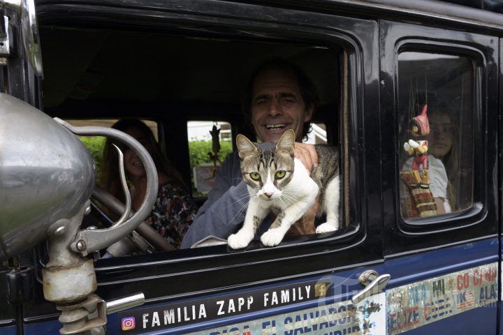 Herman Zapp Argentina dan Hakuna, kucing keluarga, melihat ke luar jendela mobil mereka, sebuah Graham-Paige 1928, di luar sebuah hotel di Gaualeguaychu, provinsi Entre Rios, Argentina, pada 10 Maret 2022. - Keluarga berharap selesai pada hari Minggu perjalanan 22 tahun keliling dunia yang dimulai pada 23 Januari 2000 di alun-alun Republica di Buenos Aires. (Photo by JUAN MABROMATA / AFP)