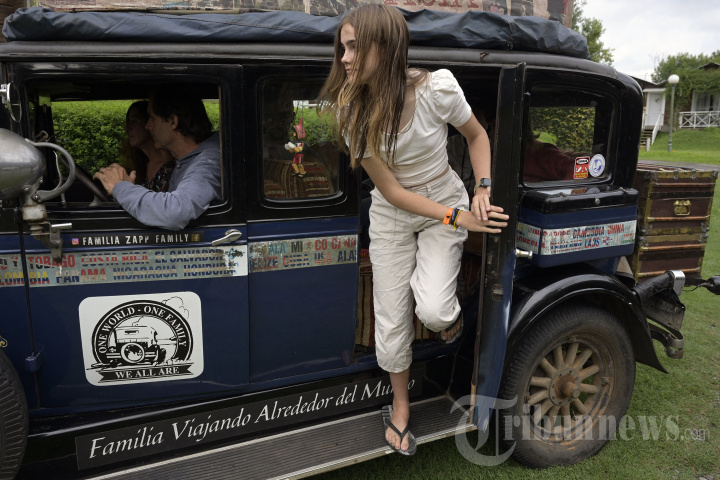 Paloma Zapp turun dari mobil keluarga Argentina, Graham-Paige 1928, di luar sebuah hotel di Gaualeguaychu, provinsi Entre Rios, Argentina, pada 10 Maret 2022. - Keluarga itu mengharapkan untuk menyelesaikan pada hari Minggu perjalanan 22 tahun keliling dunia yang dimulai pada 23 Januari 2000 di alun-alun Republica di Buenos Aires.