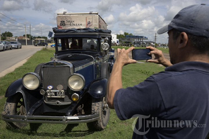 Seorang penggemar mobil mengambil foto mobil keluarga Zapp Argentina, Graham-Paige 1928, di Gaualeguaychu, provinsi Entre Rios, Argentina, pada 10 Maret 2022. - Keluarga itu mengharapkan untuk menyelesaikan pada hari Minggu perjalanan 22 tahun keliling dunia yang dimulai pada 23 Januari 2000 di alun-alun Republica di Buenos Aires. (Photo by JUAN MABROMATA / AFP)