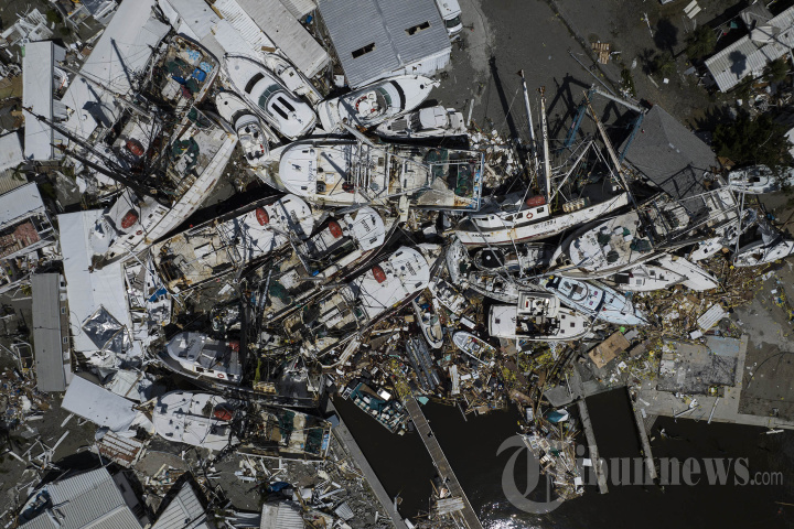Sebuah foto udara yang diambil pada 29 September 2022 menunjukkan tumpukan perahu setelah Badai Ian di Fort Myers, Florida. - Badai Ian meninggalkan sebagian besar pesisir barat daya Florida dalam kegelapan pada Kamis pagi, membawa banjir bencana yang membuat para pejabat menyiapkan respons darurat besar-besaran terhadap badai dengan intensitas yang jarang terjadi. Pusat Badai Nasional mengatakan mata badai sangat berbahaya mendarat tepat setelah pukul 15:00 (1900 GMT) di pulau penghalang Cayo Costa, sebelah barat kota Fort Myers. (Photo by Ricardo ARDUENGO / AFP)