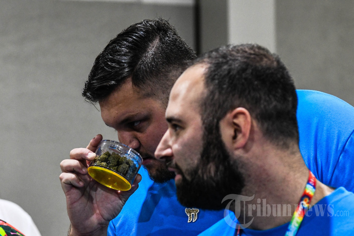 Seorang pria mencium ganja berkualitas tinggi di Cannabis & Psychedelic Expo di Miami Airport Convention Center di Miami, Florida, pada 5 Februari 2022. - Cannadelic Miami adalah konferensi dan pameran dua hari yang akan mengeksplorasi bisnis dan sains keduanya ganja dan psikedelik. (Photo by CHANDAN KHANNA / AFP)