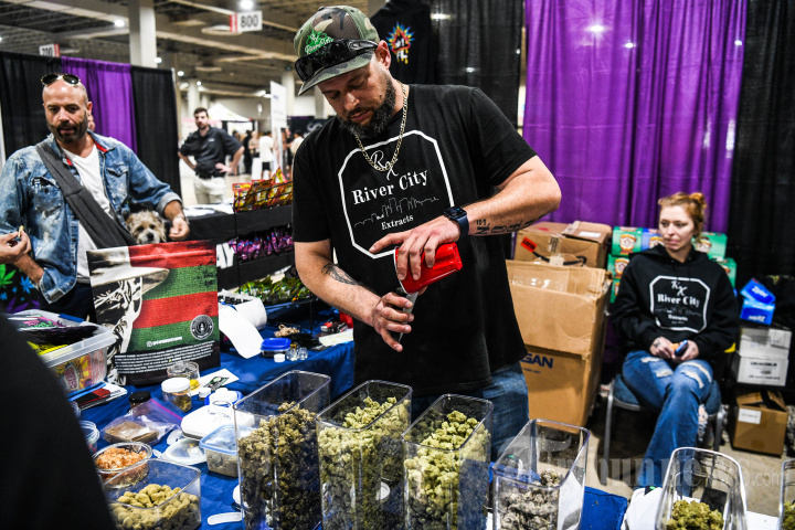 Seorang peserta pameran menjual produk ganja di stannya di Cannabis & Psychedelic Expo di Miami Airport Convention Center di Miami, Florida, pada 5 Februari 2022. - Cannadelic Miami adalah konferensi dan pameran dua hari yang akan mengeksplorasi bisnis dan sains ganja dan psikedelik. (Photo by CHANDAN KHANNA / AFP)