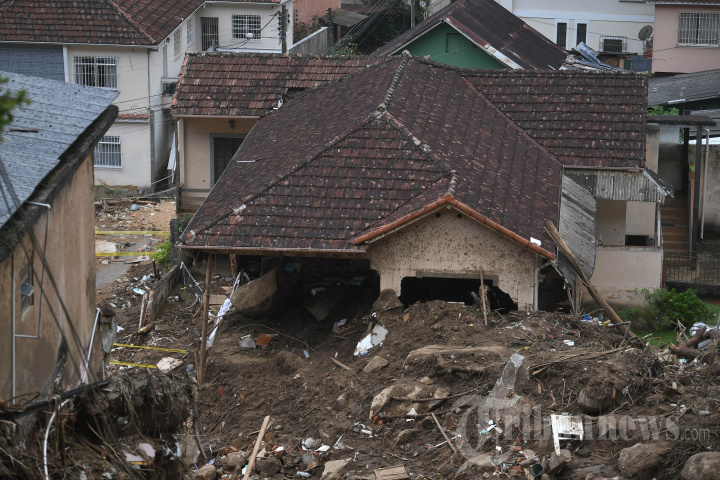 Sebuah rumah yang hancur akibat tanah longsor raksasa terlihat di Petropolis, Brasil, pada 19 Februari 2022. - Sebanyak 136 mayat telah ditemukan hingga saat ini, menurut pejabat pertahanan sipil, di kota wisata yang biasanya indah sekitar 60 kilometer (37 mil) di utara Rio de Janeiro. (Photo by MAURO PIMENTEL / AFP)