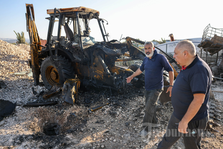 Orang-orang berjalan melewati lubang di tanah dan traktor yang terbakar setelah sebuah roket yang ditembakkan dari Lebanon selatan menghantam kota Kfar Manda di Israel utara pada 24 September 2024. - Militer Israel mengatakan lebih dari 50 proyektil ditembakkan dari Lebanon ke Israel utara pada pagi hari tanggal 24 September, saat menghantam sasaran-sasaran Hizbullah dengan serangan baru. (Photo by AHMAD GHARABLI / AFP)