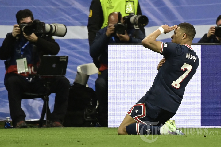 Striker Paris Saint-Germain asal Prancis, Kylian Mbappe melakukan selebrasi usai mencetak gol dalam laga leg kedua babak 16 besar Liga Champions antara Real Madrid melawan Paris Saint-Germain (PSG) di Stadion Santiago Bernabeu, Madrid, Spanyol, Kamis (10/3/2022) dini hari WIB. Real Madrid menang 3-1 (0-1) dan melaju ke babak perempat final setelah unggul agregat 3-2 atas PSG. AFP/JAVIER SORIANO