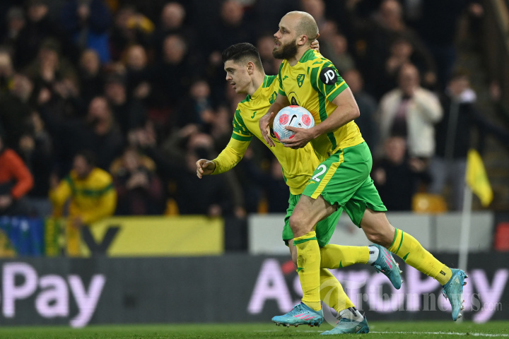 Striker Norwich City asal Finlandia, Teemu Pukki (kanan) melakukan selebrasi bersama rekan setimnya usai mencetak gol melalui tendangan penalti dalam laga lanjutan Liga Inggris antara Norwich City melawan Chelsea di Stadion Carrow Road, Norwich, Inggris timur, Jumat (11/3/2022) dini hari WIB. Pertandingan tersebut berakhir dengan skor 1-3 (0-2) untuk kemenangan tim tamu, The Blues. AFP/GLYN KIRK