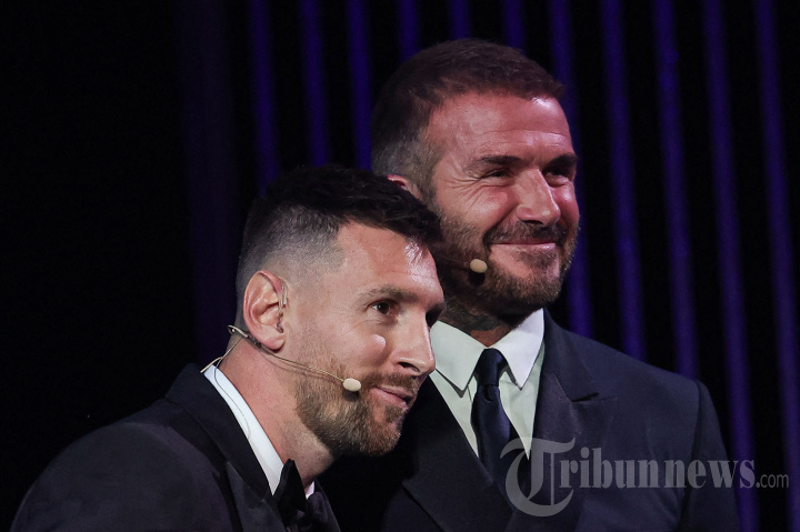 Penyerang Inter Miami CF asal Argentina Lionel Messi (kiri) bereaksi di atas panggung saat ia menerima penghargaan Ballon d'Or ke-8 di samping Mantan pemain sepak bola Inggris dan salah satu pemilik Inter Miami David Beckham pada upacara penghargaan Ballon d'Or France Football 2023 di Theatre du Chatelet di Paris pada 30 Oktober 2023. (Photo by FRANCK FIFE / AFP)