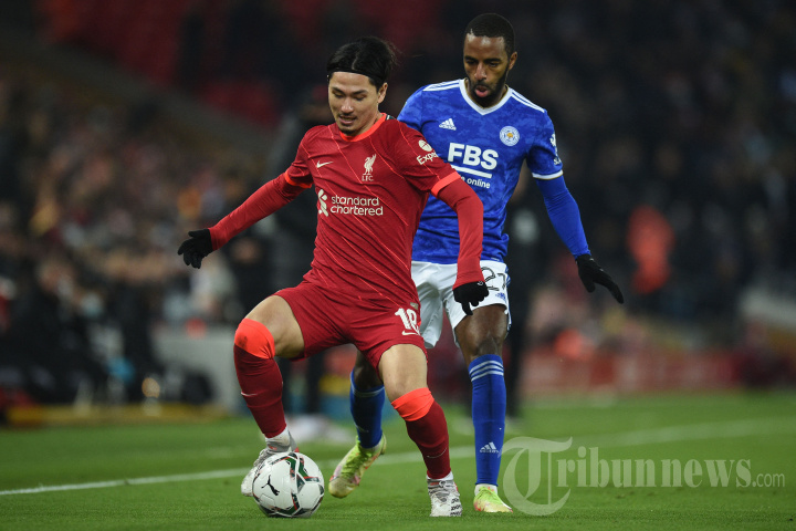 Gelandang Liverpool Jepang Takumi Minamino (kiri) bersaing dengan bek Leicester City asal Portugal Ricardo Pereira (kanan) selama pertandingan sepak bola perempat final Piala Liga Inggris antara Liverpool dan Leicester City di Anfield di Liverpool, Inggris barat laut pada 22 Desember 2021. (Photo by Oli SCARFF / AFP) / RESTRICTED TO EDITORIAL USE. No use with unauthorized audio, video, data, fixture lists, club/league logos or 'live' services. Online in-match use limited to 120 images. An additional 40 images may be used in extra time. No video emulation. Social media in-match use limited to 120 images. An additional 40 images may be used in extra time. No use in betting publications, games or single club/league/player publications. /