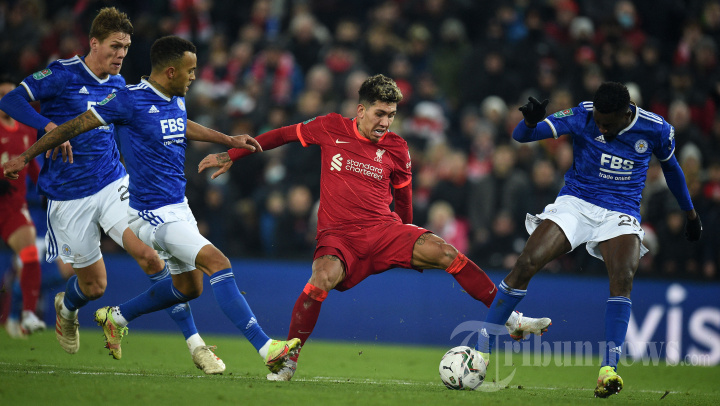 Gelandang Liverpool asal Brasil Roberto Firmino (tengah) bersaing dengan pemain tengah Leicester City asal Nigeria Wilfred Ndidi (kanan), bek Leicester City dari Denmark Jannik Vestergaard (kiri) dan bek Leicester City dari Inggris Ryan Bertrand (kedua dari kiri) selama pertandingan sepak bola perempat final Piala Liga Inggris antara Liverpool dan Leicester City di Anfield di Liverpool, barat laut Inggris pada 22 Desember 2021. (Photo by Oli SCARFF / AFP) / RESTRICTED TO EDITORIAL USE. No use with unauthorized audio, video, data, fixture lists, club/league logos or 'live' services. Online in-match use limited to 120 images. An additional 40 images may be used in extra time. No video emulation. Social media in-match use limited to 120 images. An additional 40 images may be used in extra time. No use in betting publications, games or single club/league/player publications. /