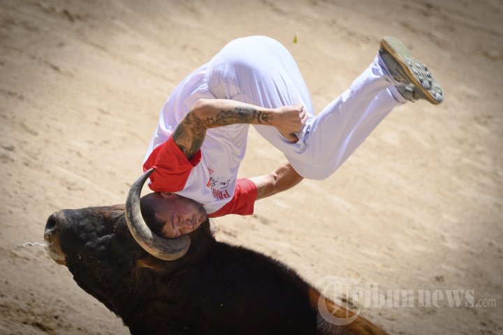 Seorang recortador melompati seekor banteng di arena adu banteng Plaza de Toros dalam pertunjukan setelah hari pertama festival San Fermin di Pamplona, ??Spanyol utara, pada 7 Juli 2024. (Photo by MIGUEL RIOPA / AFP)