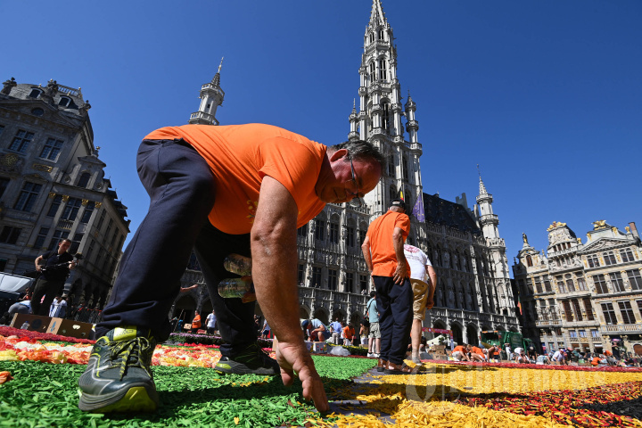 Seorang sukarelawan mengerjakan pembuatan Karpet Bunga di Grand-Place di Brussel pada 12 Agustus 2022. - Rangkaian begonia Karpet Bunga Brussel edisi ke-22 sejak pembuatannya pada tahun 1971 berlangsung dari 12 hingga 15 Agustus 2022. (Photo by JOHN THYS / AFP)