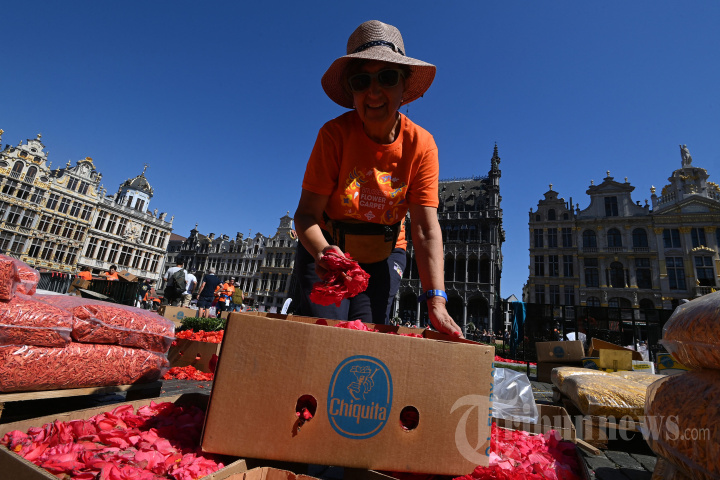 Seorang sukarelawan mengerjakan pembuatan Karpet Bunga di Grand-Place di Brussel pada 12 Agustus 2022. - Rangkaian begonia Karpet Bunga Brussel edisi ke-22 sejak pembuatannya pada tahun 1971 berlangsung dari 12 hingga 15 Agustus 2022. (Photo by JOHN THYS / AFP)