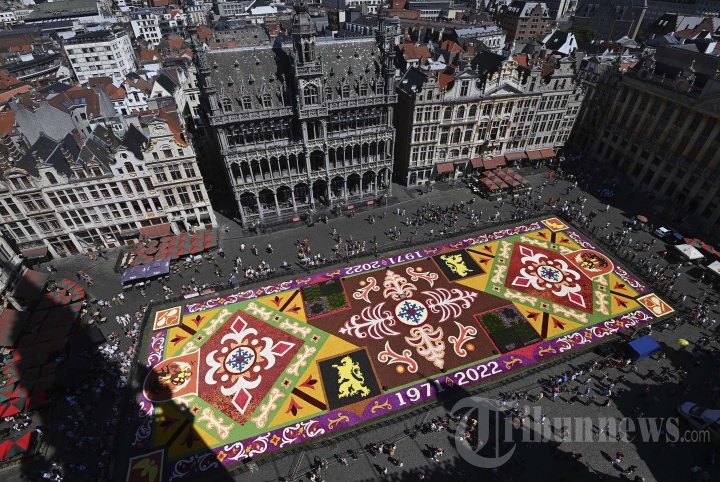 Pemandangan umum menunjukkan Karpet Bunga di Grand-Place di Brussel pada 12 Agustus 2022. - Rangkaian begonia Karpet Bunga Brussel edisi ke-22 sejak dibuat pada tahun 1971 berlangsung dari 12 hingga 15 Agustus 2022. (Photo by JOHN THYS / AFP)