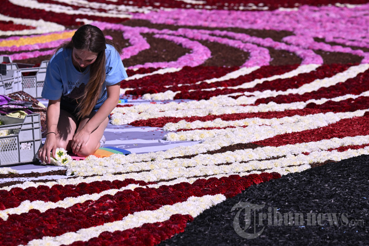 Seorang relawan merangkai bunga untuk membuat karpet bunga di Grand-Place selama pameran Karpet Bunga Brussels edisi ke-23, di Brussels pada tanggal 15 Agustus 2024. - Pameran Karpet Bunga Brussels ke-23 akan berlangsung dari tanggal 15 hingga 18 Agustus 2024. (Photo by JOHN THYS / AFP)
