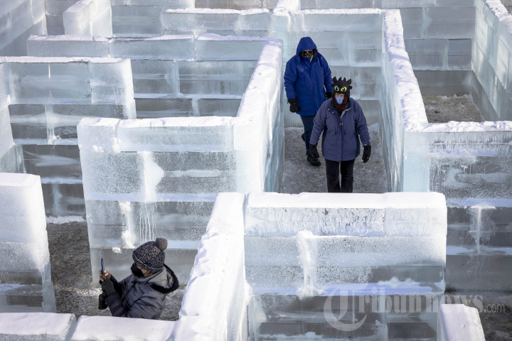 Orang-orang berjalan di Ice Palace Maze di Stillwater, Minnesota pada 21 Januari 2022. - Labirin es Teater Zephyr dikenal sebagai labirin es terbesar di Amerika Serikat, dirancang oleh Franz Hall dari The Zephyr Theatre. Konstruksi membutuhkan 10.742 kaki persegi es dalam 2.900 balok, dan lebih dari 3.000 LED multiwarna. (Photo by Kerem Yucel / AFP)