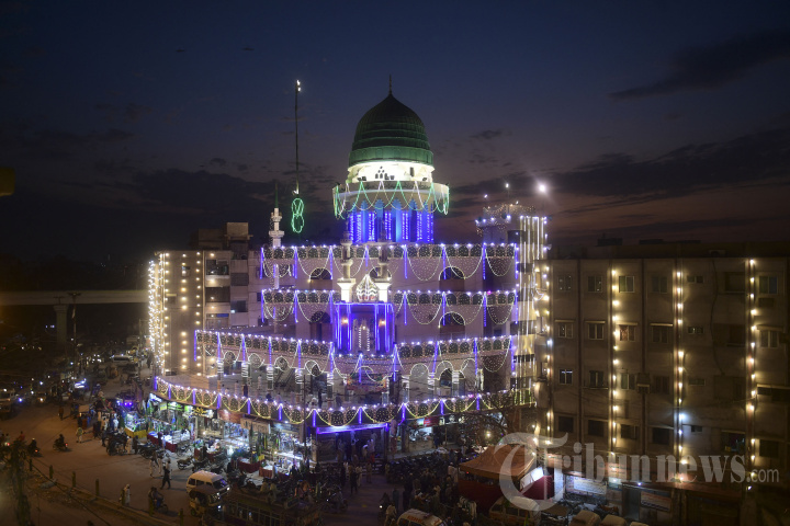 Pemandangan umum menunjukkan sebuah masjid yang diterangi cahaya menjelang perayaan hari kelahiran Nabi Muhammad, di kota pelabuhan Karachi, Pakistan pada 7 Oktober 2022. (Photo by Asif HASSAN / AFP)