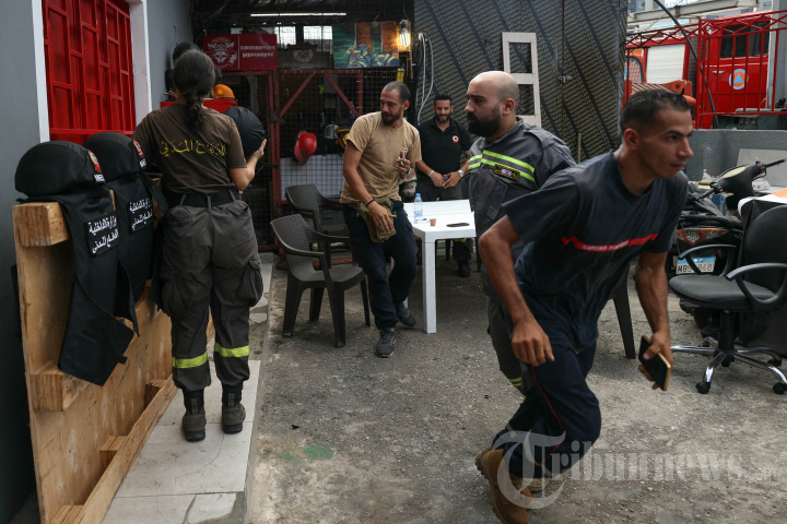 Anggota Pertahanan Sipil Lebanon bersiap sebelum menanggapi keadaan darurat di pos mereka di lingkungan Cola, Beirut, pada 13 Oktober 2024. - Di seluruh negeri, petugas penyelamat berjuang untuk menanggapi, dengan sumber daya mereka yang telah terkuras oleh krisis ekonomi selama lima tahun dan takut bahwa mereka dapat terbunuh seperti puluhan rekan kerja mereka selama setahun terakhir. (Photo by IBRAHIM AMRO / AFP)