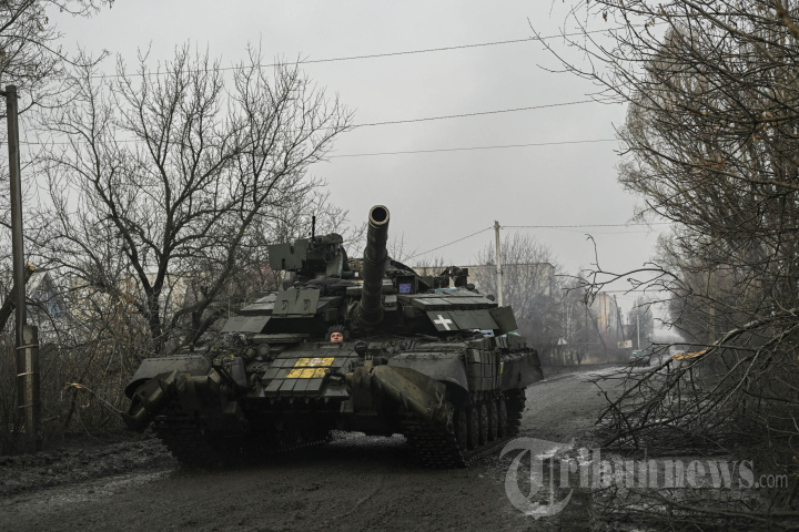 Sebuah tank Ukraina bergerak menuju garis depan dekat kota Bakhmut, pada 8 Maret 2023, di tengah invasi Rusia ke Ukraina. (Photo by Aris Messinis / AFP)