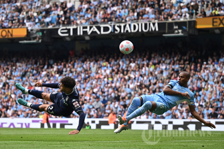 Gelandang Aston Villa asal Brasil Philippe Coutinho (kiri) menyundul bola saat dia memperebutkannya dengan gelandang Manchester City asal Brasil Fernandinho selama pertandingan sepak bola Liga Premier Inggris antara Manchester City dan Aston Villa di Stadion Etihad di Manchester, barat laut Inggris, pada 22 Mei , 2022. (Photo by Oli SCARFF / AFP)
